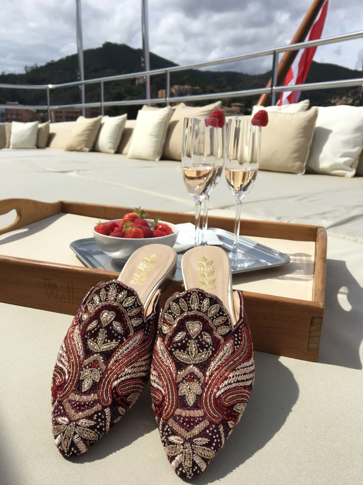 It all begins with an idea. Hand embroidered silk and pearl mules.